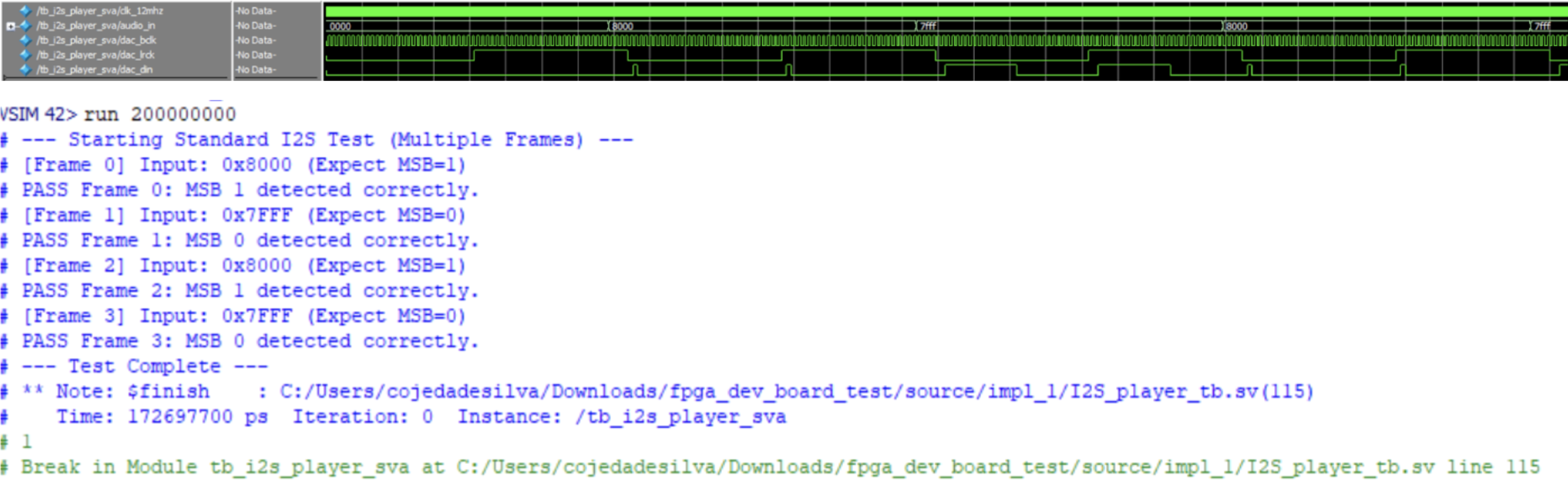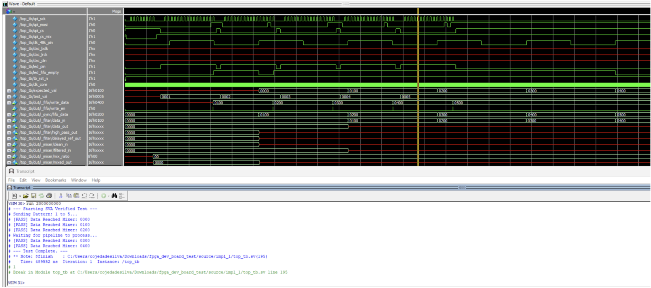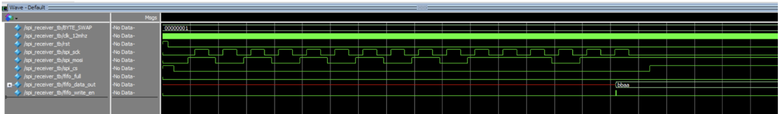 Anything after the filter will not show data, since it needs 128 samples to function. Everything else operates correctly: SPI reads values into test_val (after byte swap). Data is saved faster than the 48 kHz clock but output at 48 kHz, as intended.