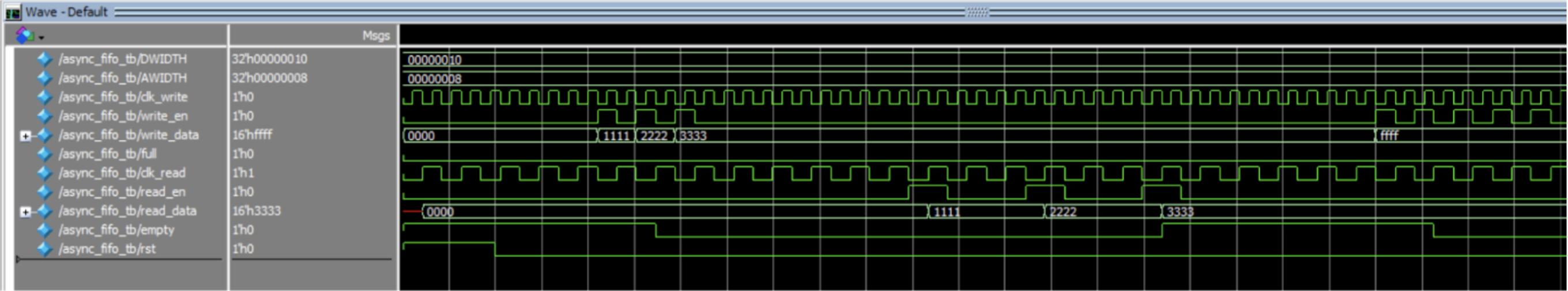 We can see how 1111, 2222, and 3333 are sent (2‑byte samples matching audio sample length) and retrieved using a differently timed clock (read enable is slower than write enable).