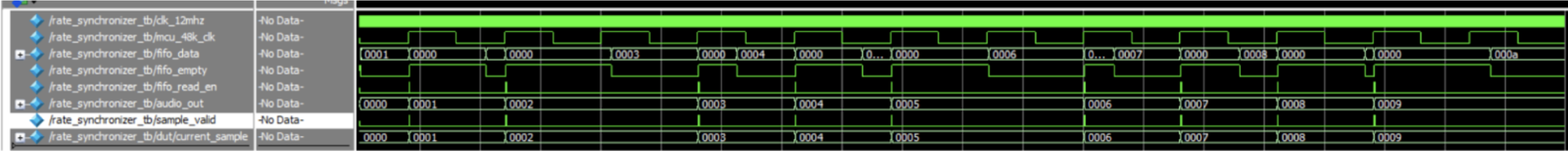 The synchronizer reads the FIFO at the MCU‑specified rate (usually 48 kHz, up to ~90 kHz). It converts occasionally noisy FIFO output (like 0000) into a continuous, correctly‑timed stream.
