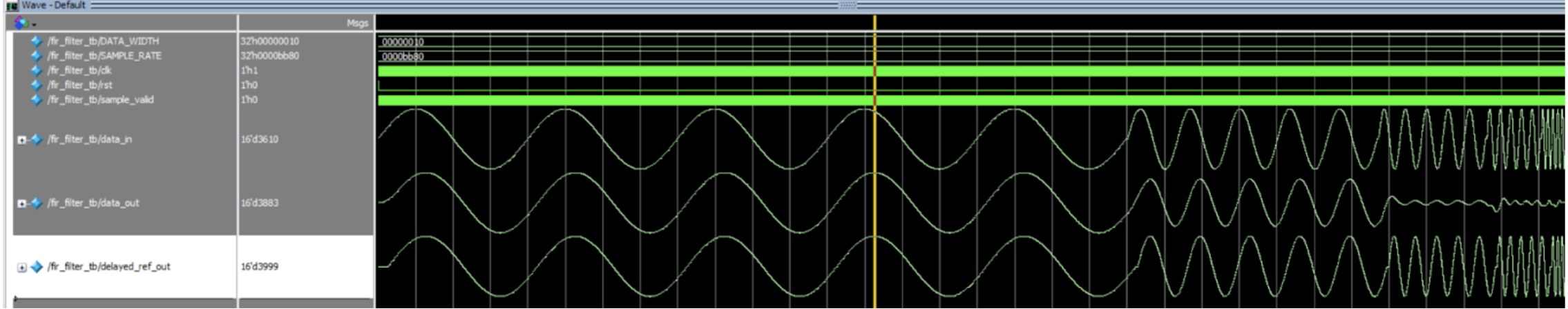 This data then gets relayed to the FIR filter, which has an inbuilt RAM module to store 128 samples. A moving average low-pass filter is then applied. Since an ideal FIR filter needs to “read the future,” we delay the “present” sample by 64 samples: