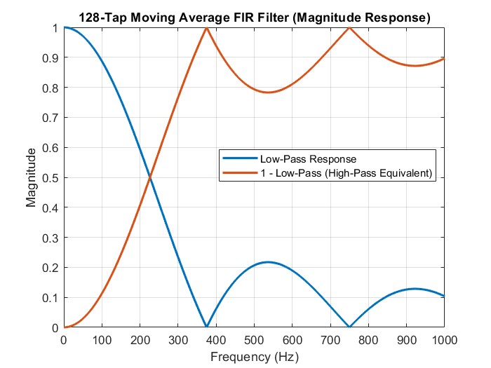 Using a Moving Average filter as the lowpass filter was probably not an ideal choice, but its simplicity and results were good. This filter should have a “corner frequency” of around 165 Hz, done with the formula:
