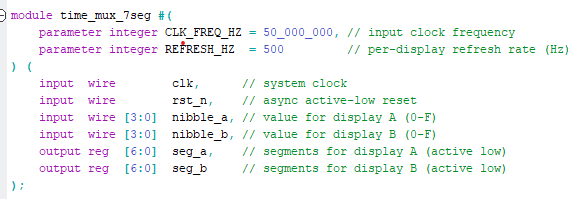 For both outputs, the quality was not bad. HOwever, it did seem it overcomplicated the code, crafting an osc and utilizing wires for logic. I was surpised to see wires be used rather than just logic. I was surprisesd to see it compiled for the first prompt, and not utilize the oscilliator for the second prompt. My main issues with both codes is how it set two sets of seven outputs for each individual segemnt display when just one would have been enough.