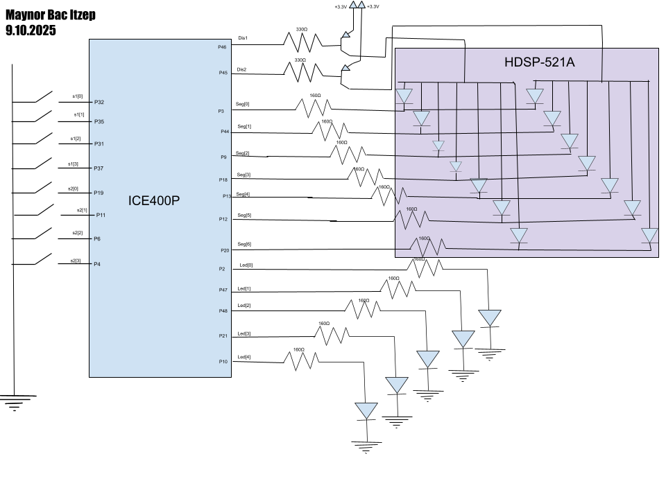 The schematic shows the physical layout of the circut/design. The output LEDs are connected to a 160 Ohm resistor to bring down the output current of the pins. Two wires that helped power the displays were linked up to a transistors to help prevent the current exceeding the maximum output of the pins, attached to a 330 Ohm resistor to ensure when powered off, the current flows through the resistor. Finally, the segment LED themsevlevs were hooked to 160 Ohm resistors to prevent leakage and maintain stable brightness.